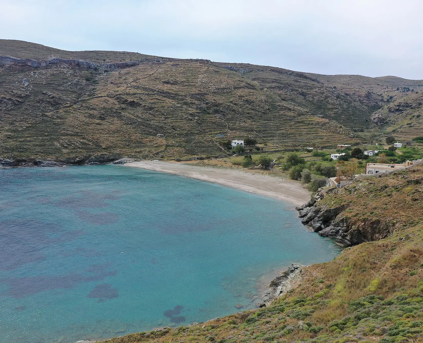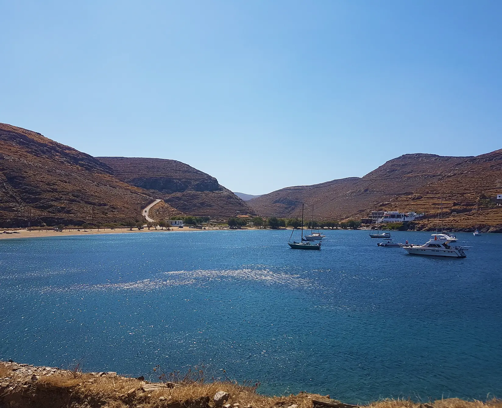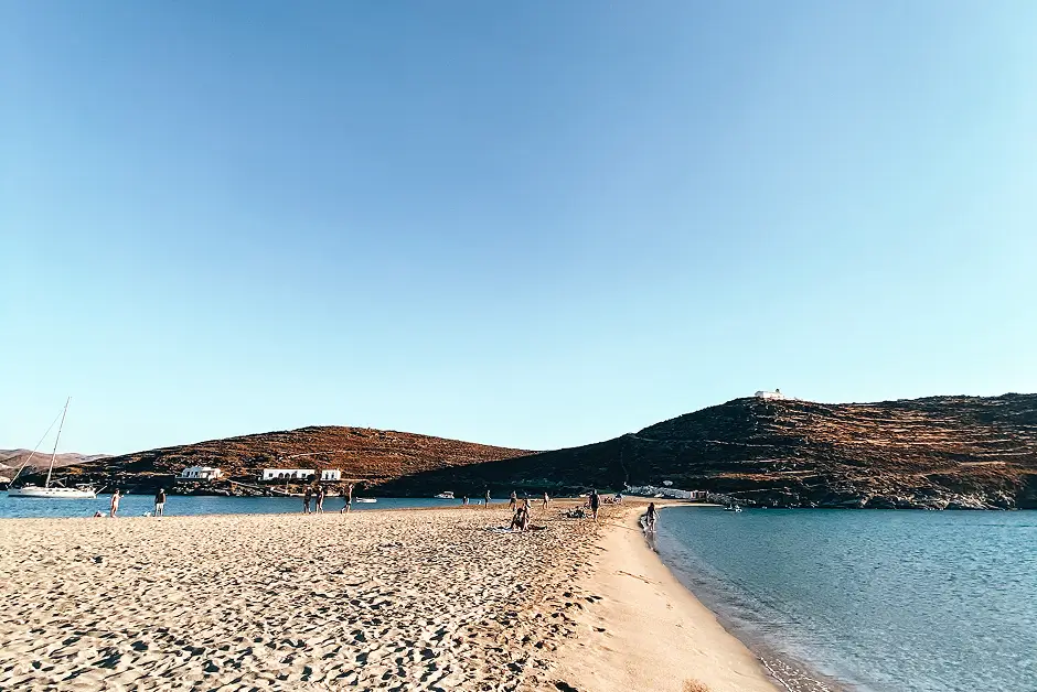Just a short drive from Merichas and one of the most accessible beaches on the island, Apokrousi is a favorite among locals for a reason. Framed by rocky hills and kissed by long stretches of golden sand, it’s one of the largest and most inviting beaches in Kythnos. The waters here are calm, shallow, and family-friendly; perfect for a relaxed swim or a long, sun-drenched afternoon.