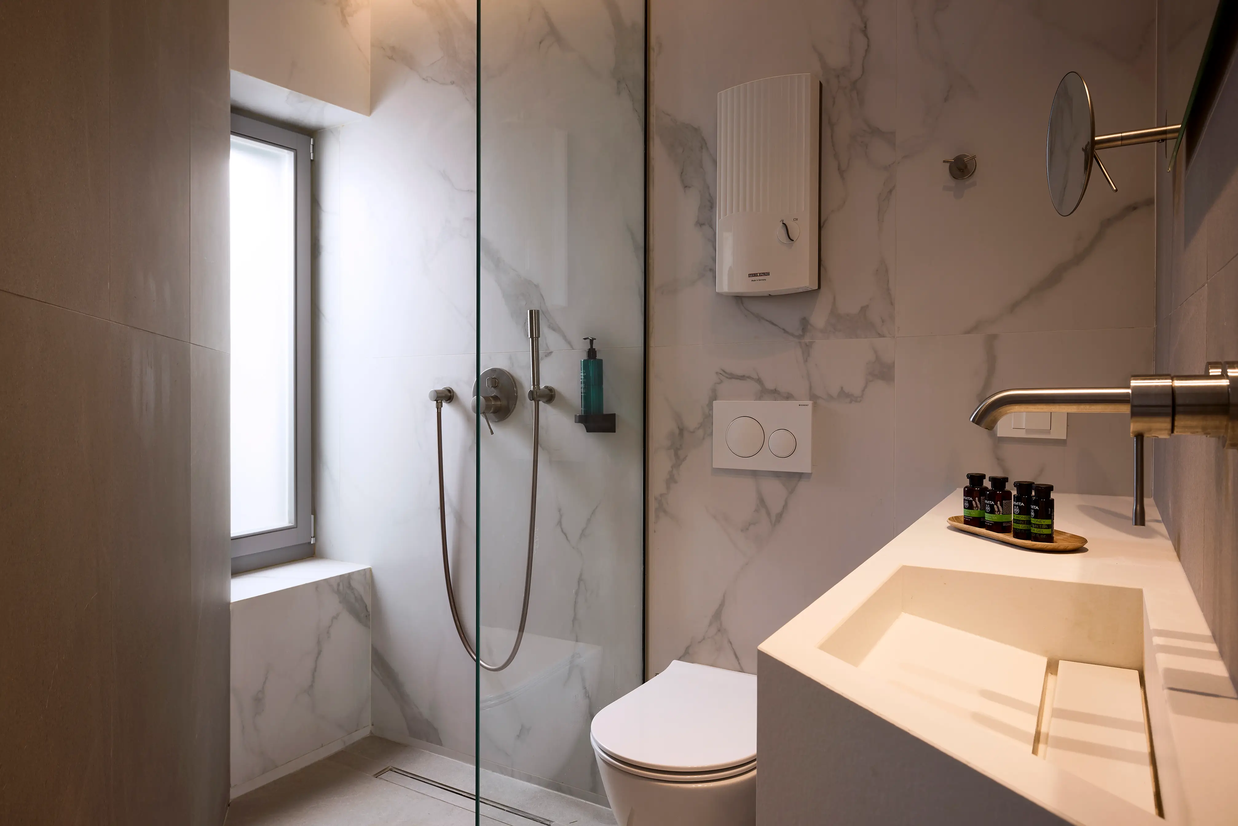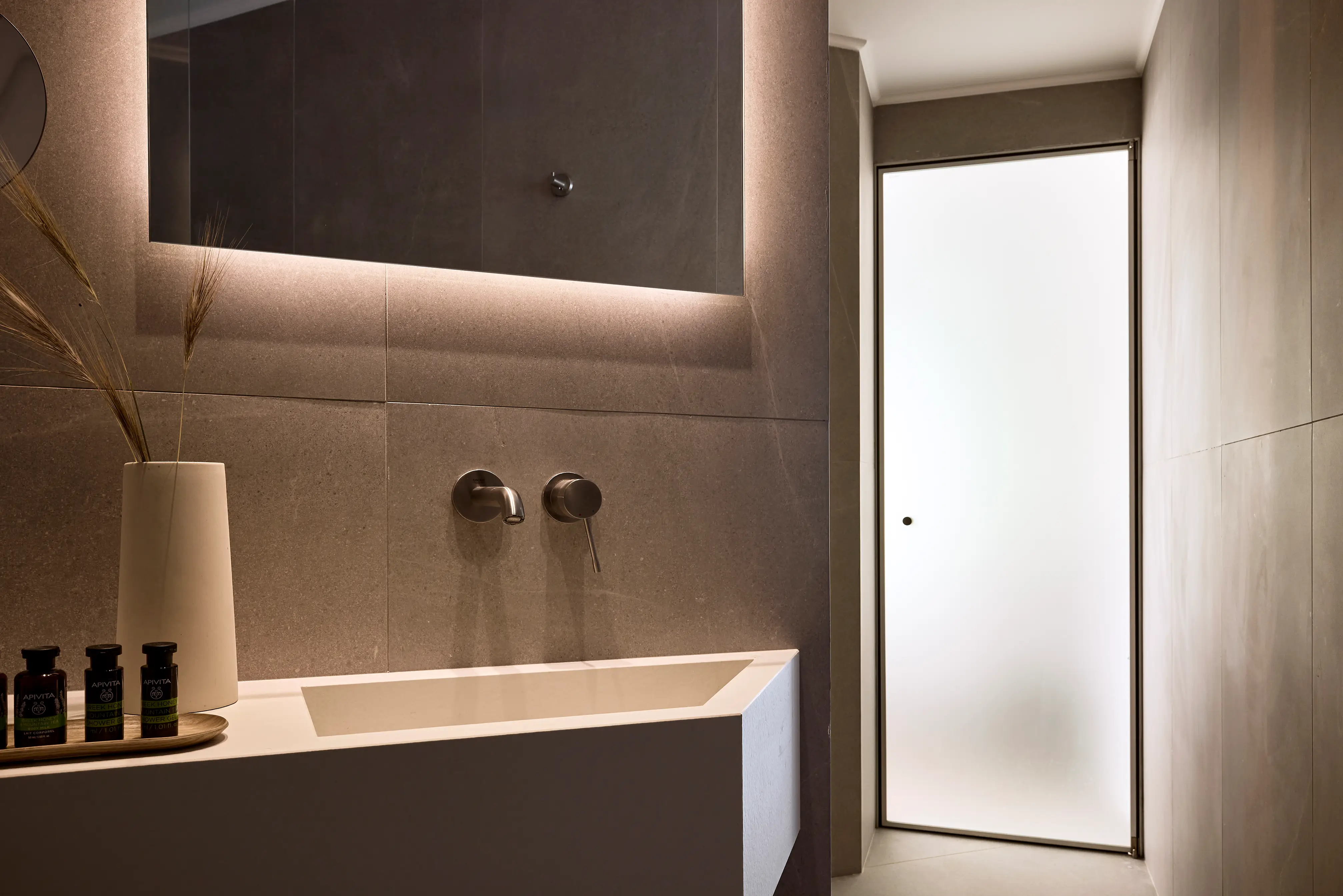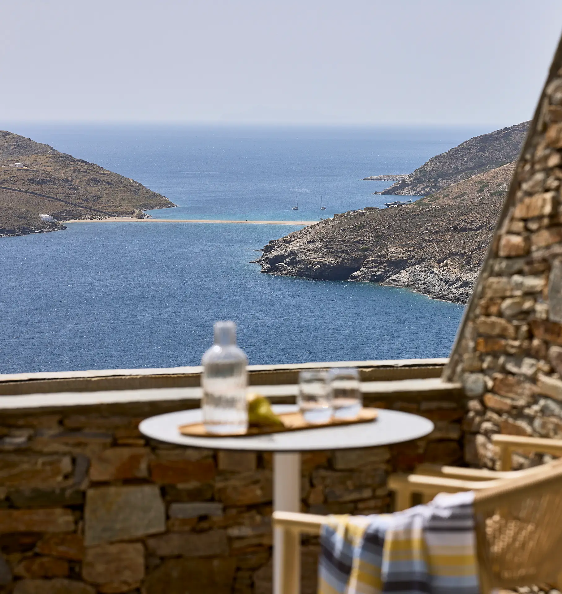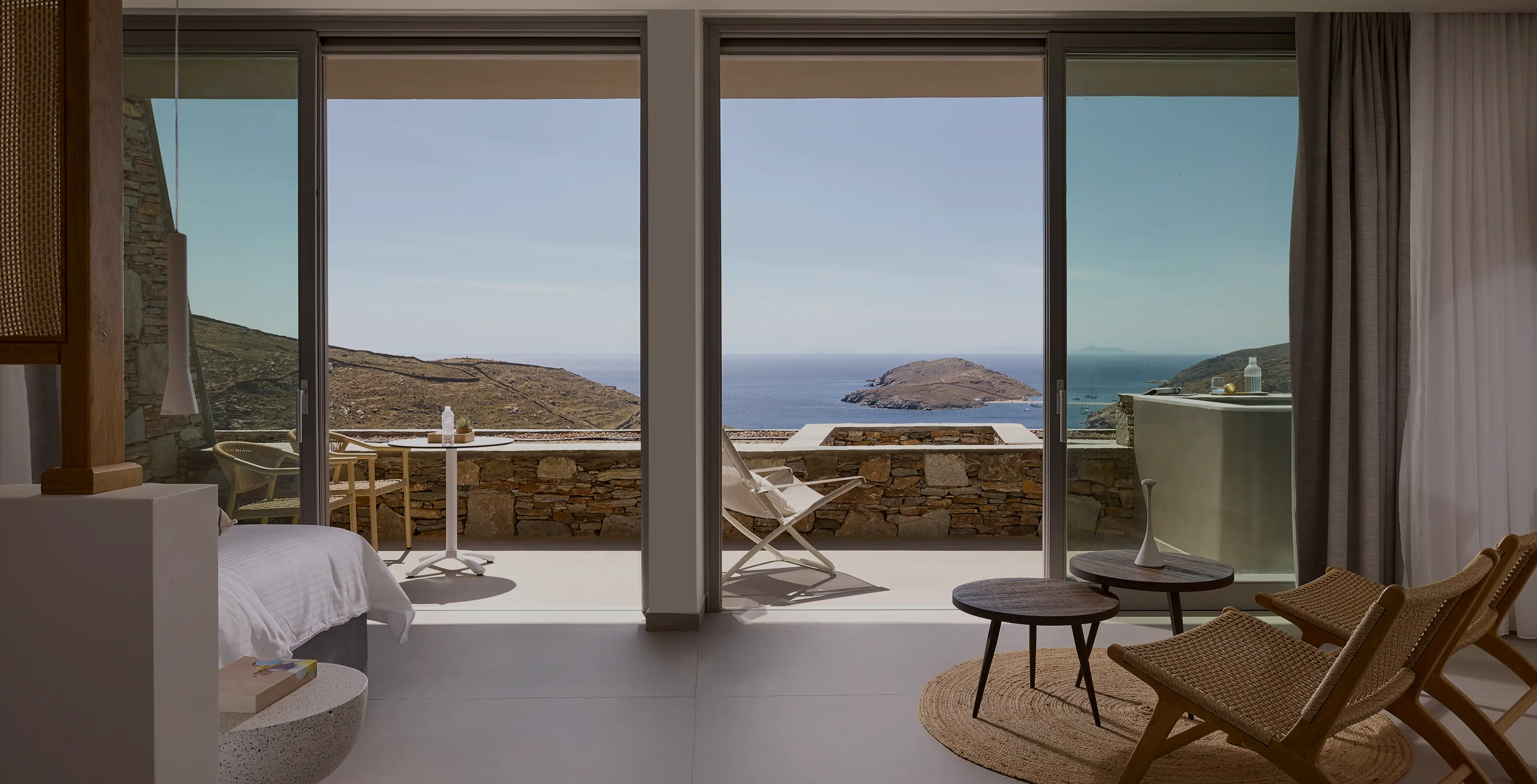 A bright, well-composed 25m² suite designed for two, with uninterrupted sea views from a private balcony. The interiors are calm and balanced: stone-toned surfaces, natural light, and clean lines throughout. Every element is placed with purpose, framing the horizon while offering space to slow down and feel at ease