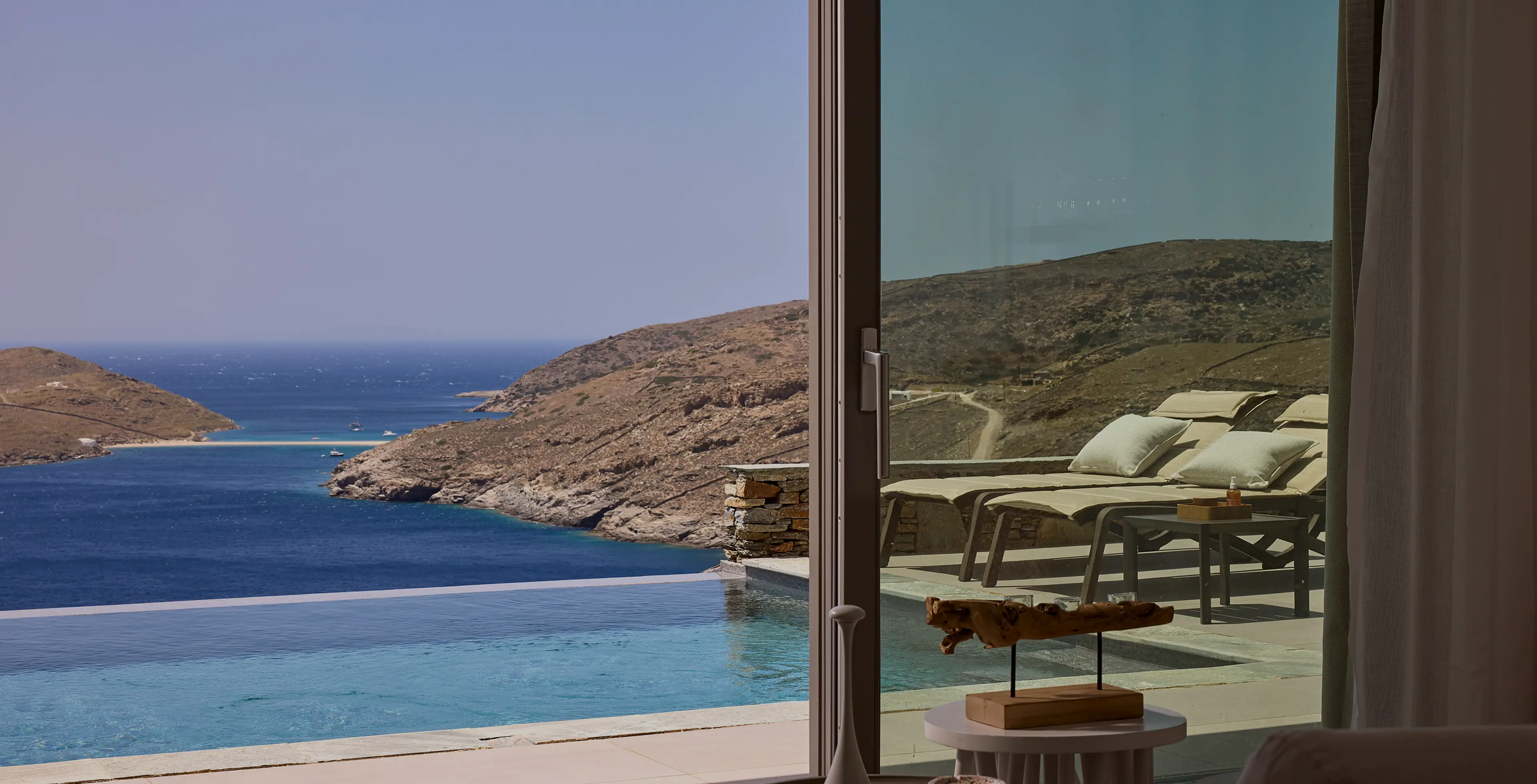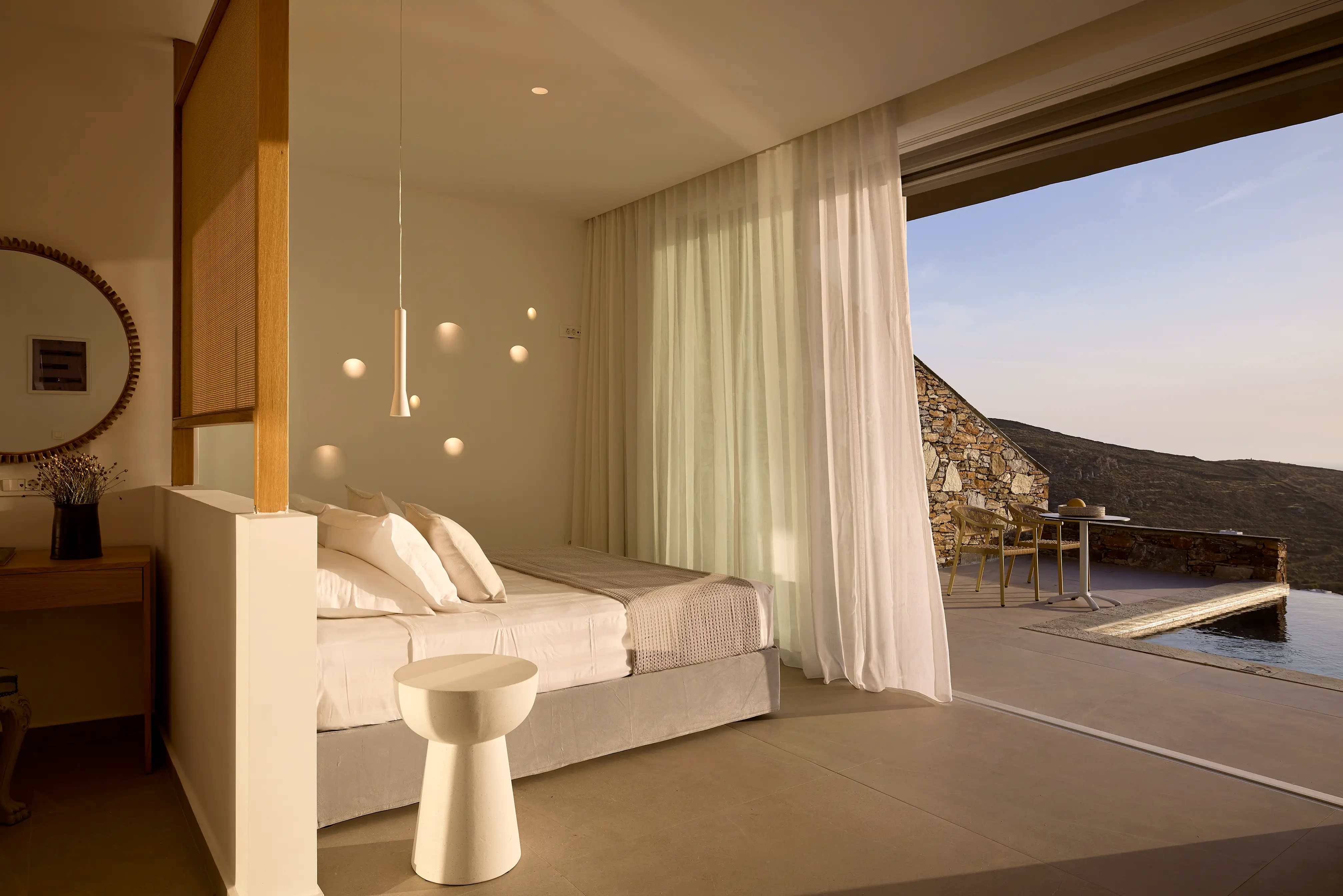 A private outdoor mini pool with panoramic sea views. A spacious layout with a large double bed and walk-in dressing area. Your own sunlit terrace, a curated coffee station, and a flat-screen TV with streaming access. Every element is chosen for comfort, privacy, and elevated island living.