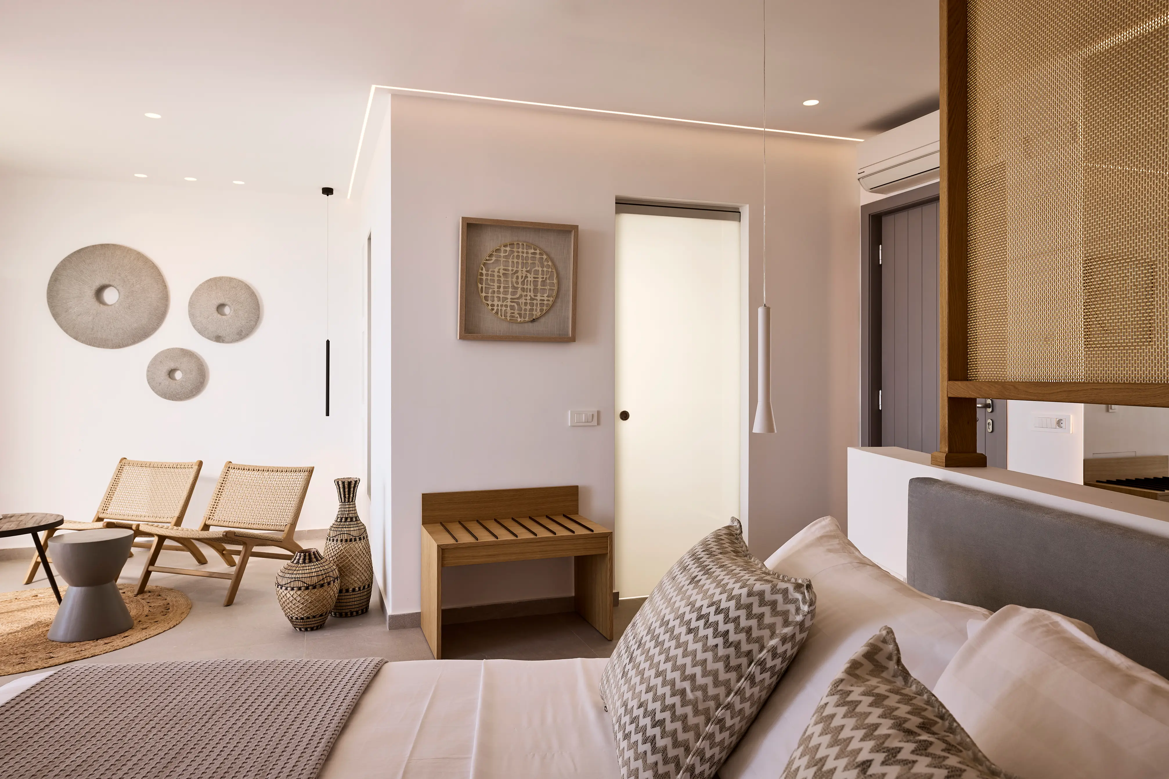 Designed with openness in mind, this 35 m² suite offers a seamless flow from indoors to out. The private terrace and the mini pool stretch toward the horizon, while inside, clean architectural lines and curated comforts shape a serene, unbroken rhythm of rest