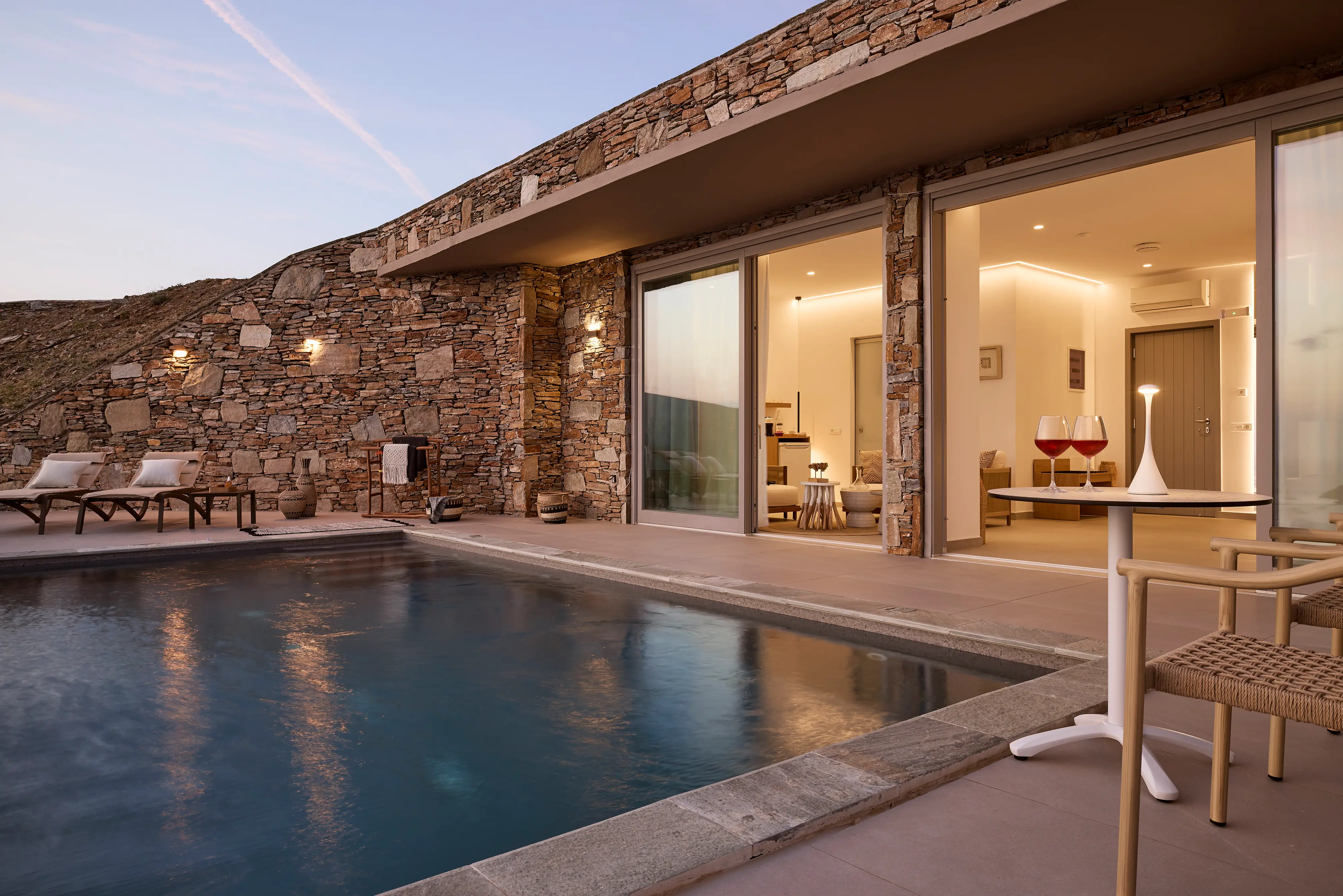From the sea-facing mini pool and private terrace to the stone textures, generous glass openings, and open-plan flow, every feature in this suite is designed to heighten the feeling of ease. Light moves freely, the view is ever-present, and the architecture gives space to unwind without distraction