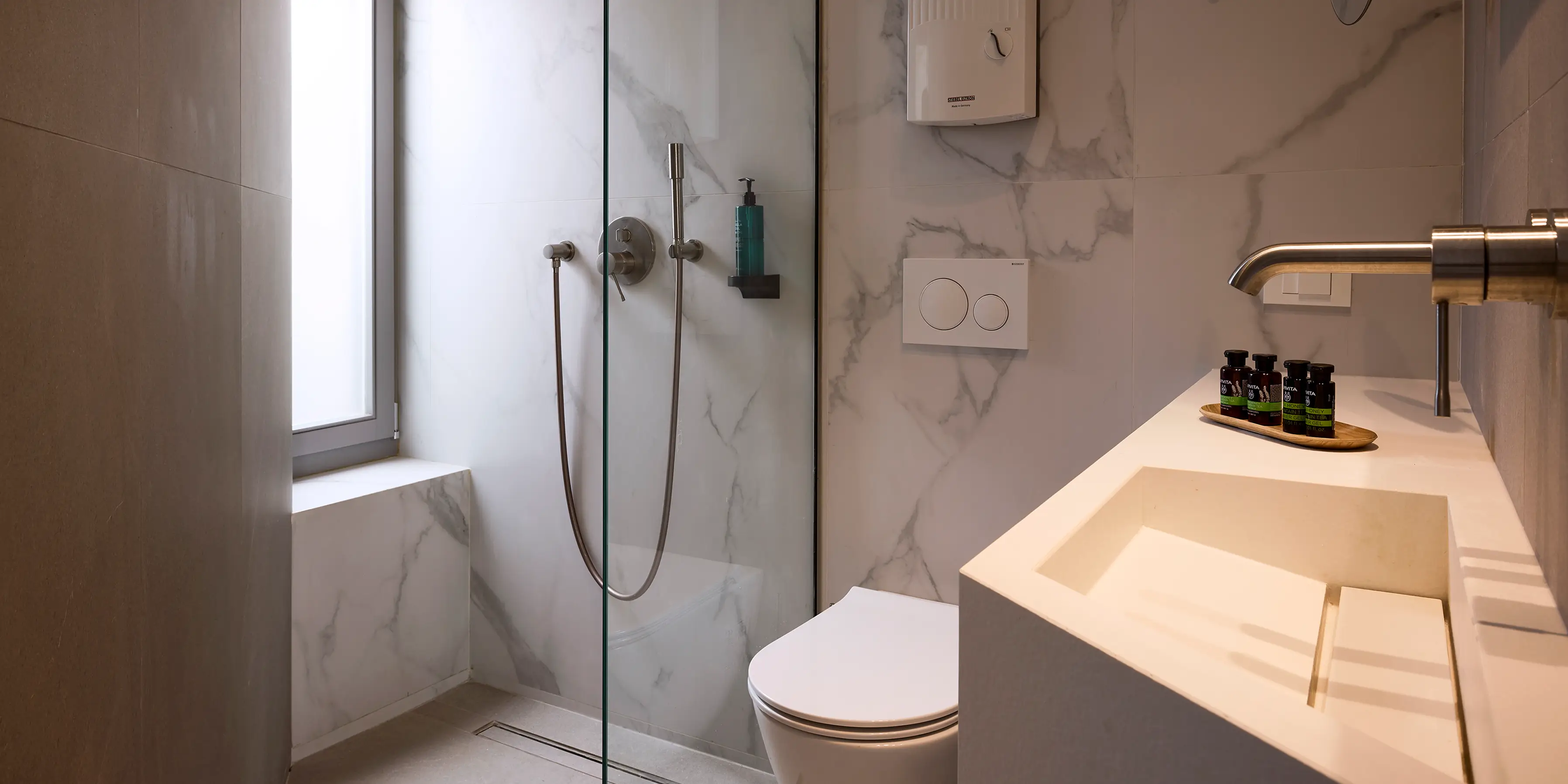 A bright, well-composed 25m² suite designed for two, with uninterrupted sea views from a private balcony. The interiors are calm and balanced: stone-toned surfaces, natural light, and clean lines throughout. Every element is placed with purpose, framing the horizon while offering space to slow down and feel at ease