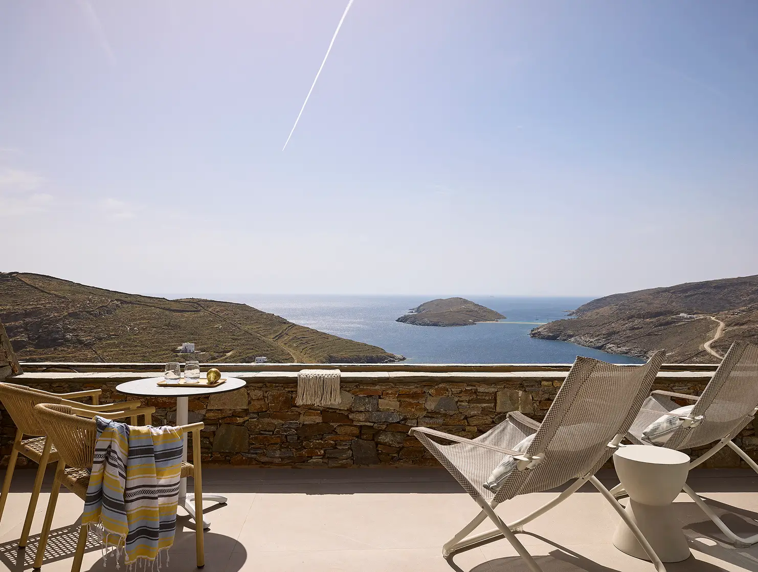 A private outdoor mini pool with panoramic sea views. A spacious layout with a large double bed and walk-in dressing area. Your own sunlit terrace, a curated coffee station, and a flat-screen TV with streaming access. Every element is chosen for comfort, privacy, and elevated island living.