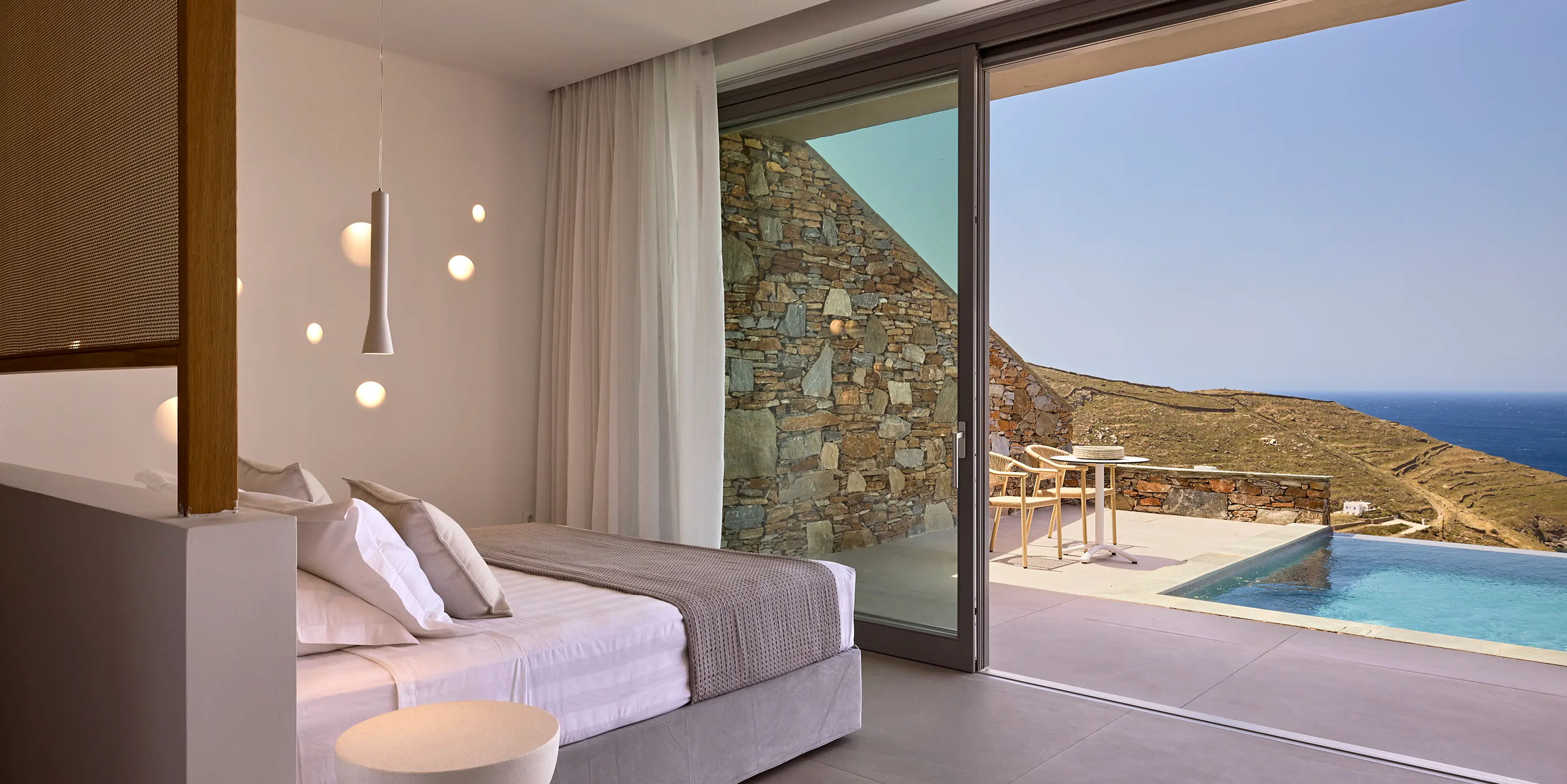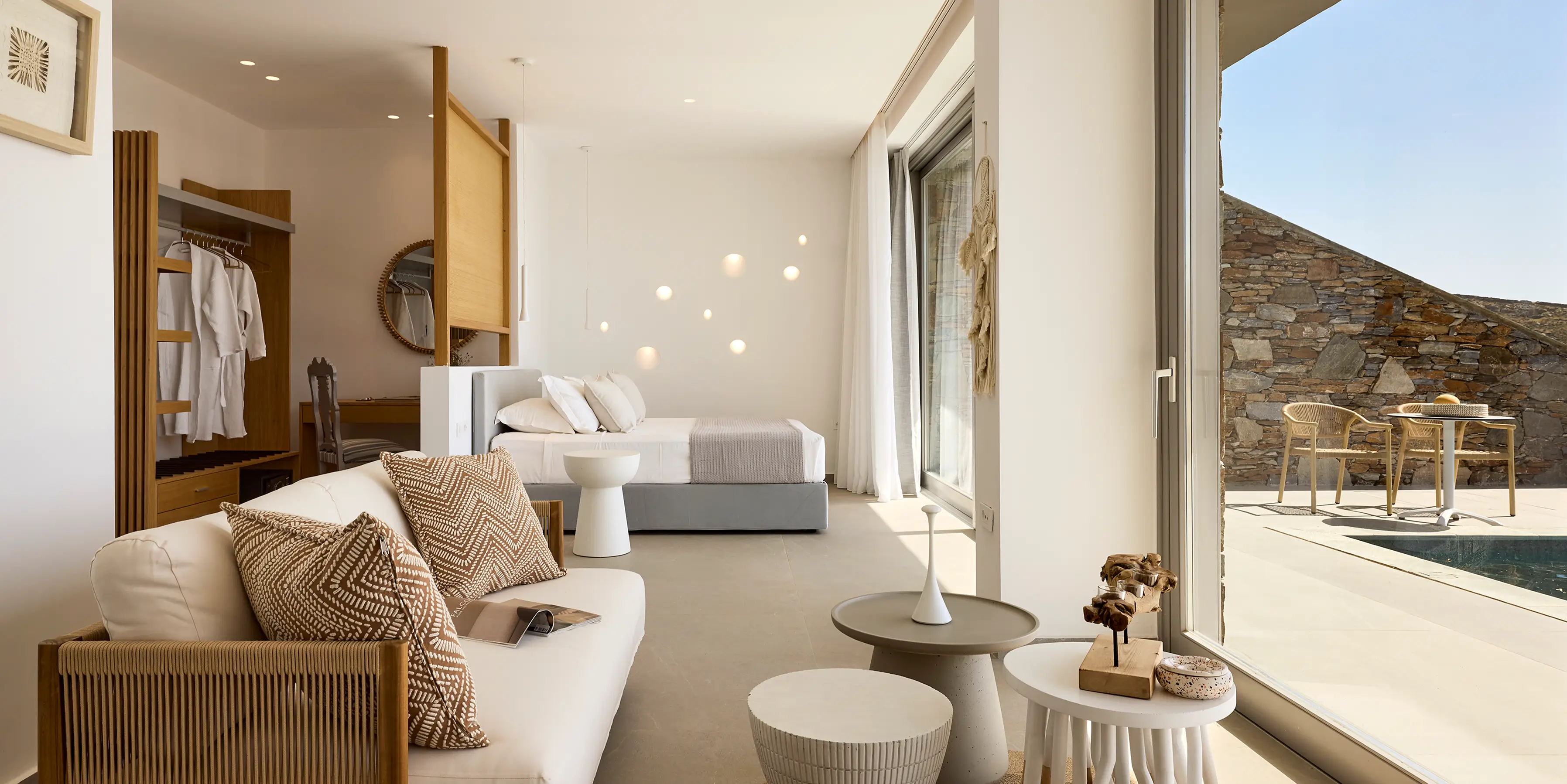 A private outdoor mini pool with panoramic sea views. A spacious layout with a large double bed and walk-in dressing area. Your own sunlit terrace, a curated coffee station, and a flat-screen TV with streaming access. Every element is chosen for comfort, privacy, and elevated island living.